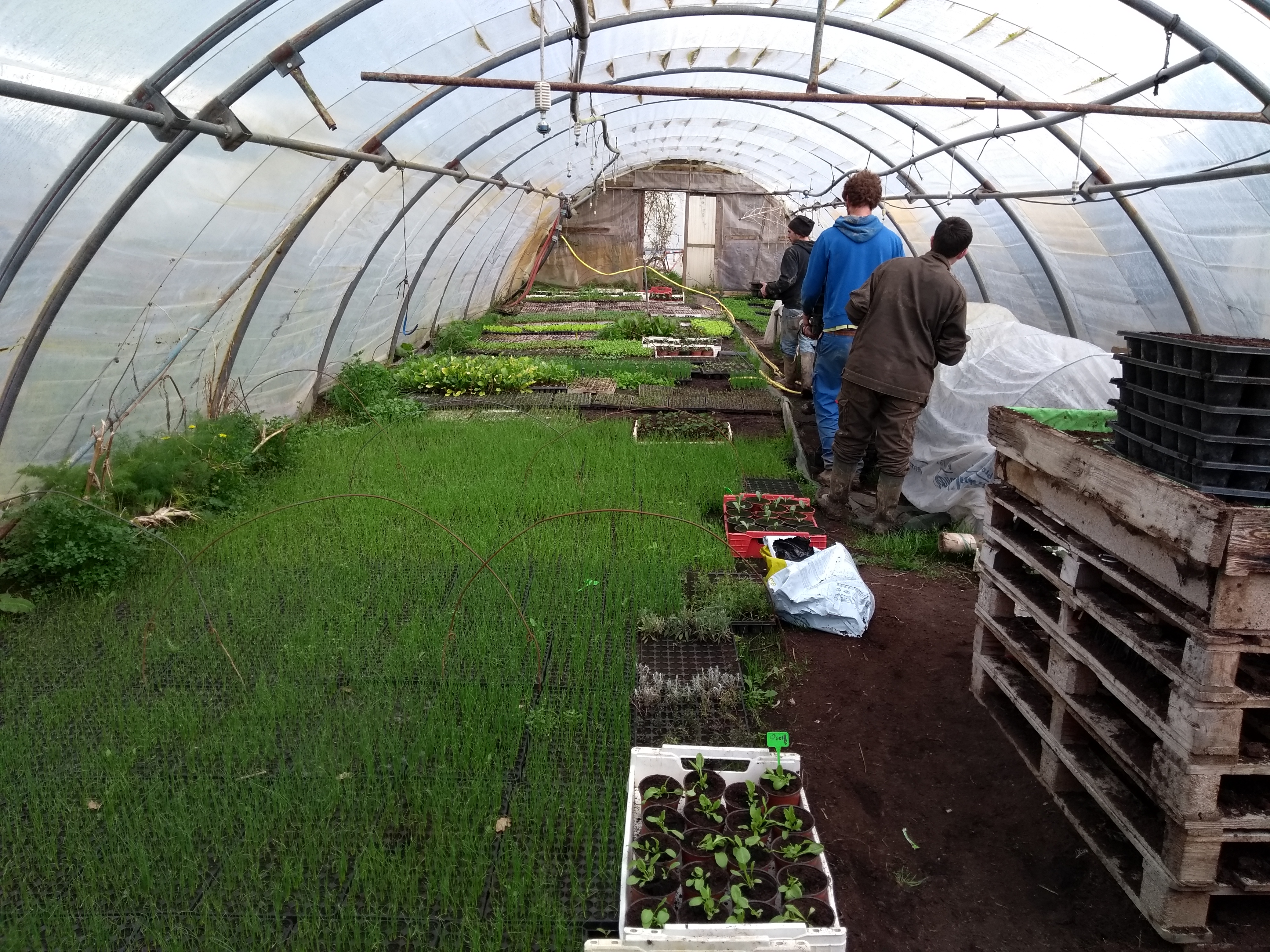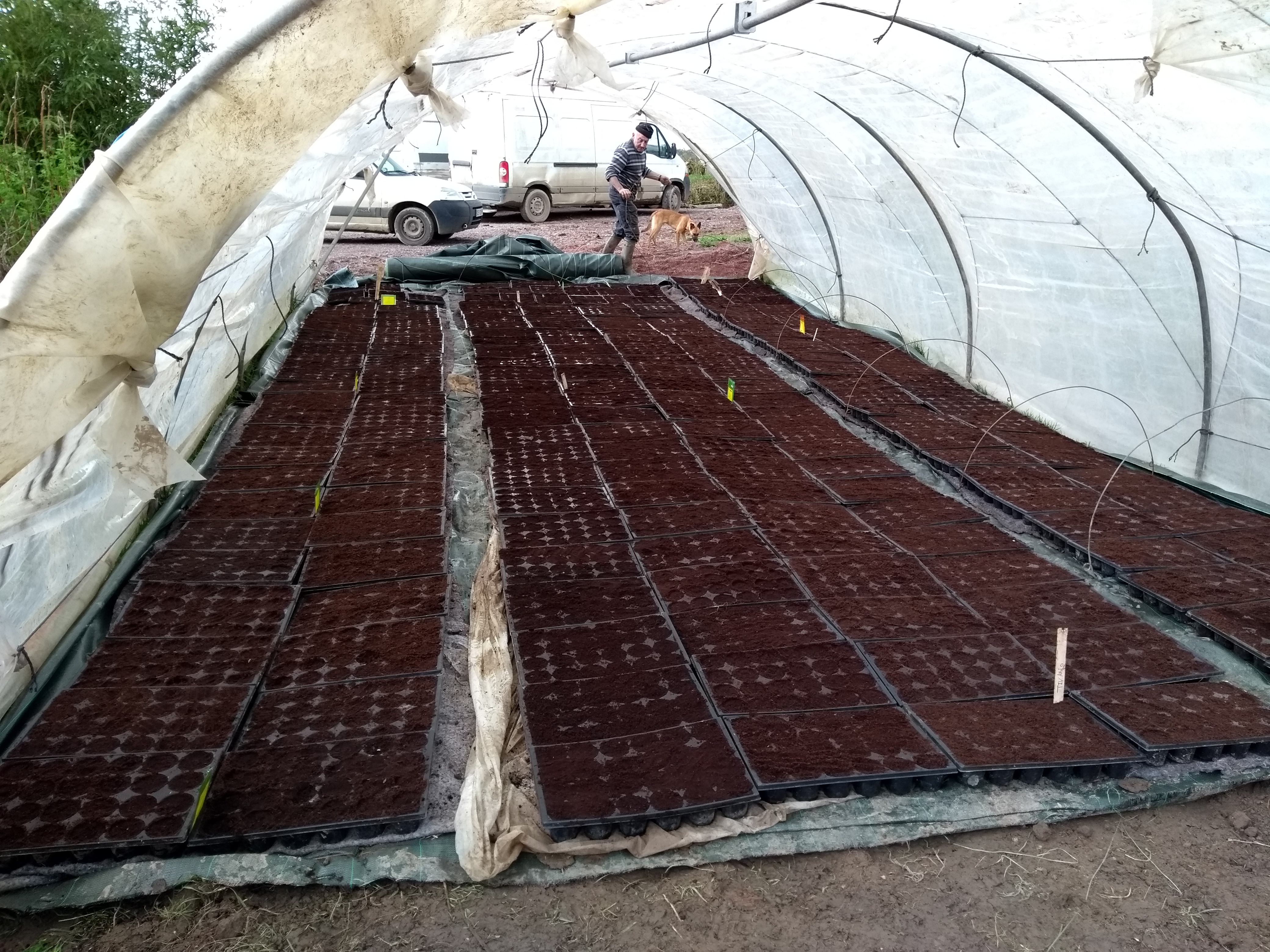 Tasser le terreau dans les plaques des godets par 24 (en tout 250 plaques), disposer une graine de courge dans chaque godet, préparer la serre dédiée aux semis de courges sans oublier la toile anti-mulot dessous, ranger les plaques de semis sous la serre (voir  photo 1), sont les activités réalisées ce matin.