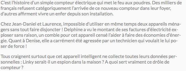 atteinte à la vie privée, ce compteur transmettant directement à Enedis, et aux opérateurs d’énergie, les habitudes de consommation des utilisateurs,