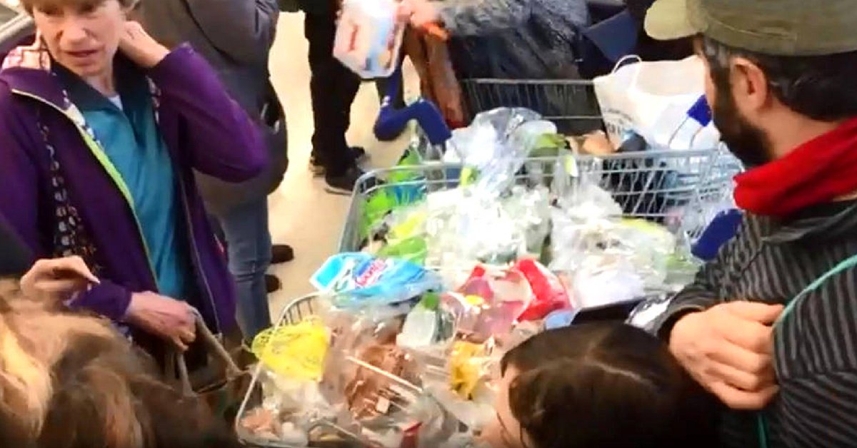 Après avoir rempli leurs chariots de produits en tout genre, les manifestants sont passés à la caisse, ont payé leur note… puis ont sorti leurs cutters et autres ciseaux pour passer à l’action !